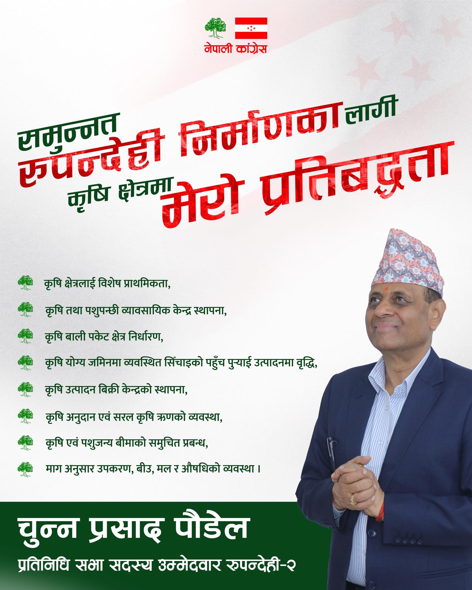 रुपन्देही। नेपाली कांग्रेसबाट रुपन्देही–२ का प्रतिनिधिसभा सदस्य उम्मेदवार चुन्न प्रसाद पौडेलले आफू निर्वाचित भए कृषि क्षेत्रमा देखिएका समस्या समाधानलाई पहिलो प्राथमिकता दिने प्रतिबद्धता जनाएका छन्। “हरेक एजेण्डा लागू गर्छु, भन्ने प्रतिबद्धता, सन्देशसहित सार्वजनिक गरिएको उनको घोषणापत्रले कृषि सुधारलाई केन्द्रमा राखेको छ। रुपन्देही क्षेत्र नम्बर–२ मा यसपालि चुनावी बहसको केन्द्र कृषि बनेको छ । पौडेलले आफू निर्वाचित भए कृषि क्षेत्रलाई केन्द्रमा राखेर जिल्लाको समग्र आर्थिक रूपान्तरण गर्ने प्रतिबद्धता व्यक्त गरेका छन्।