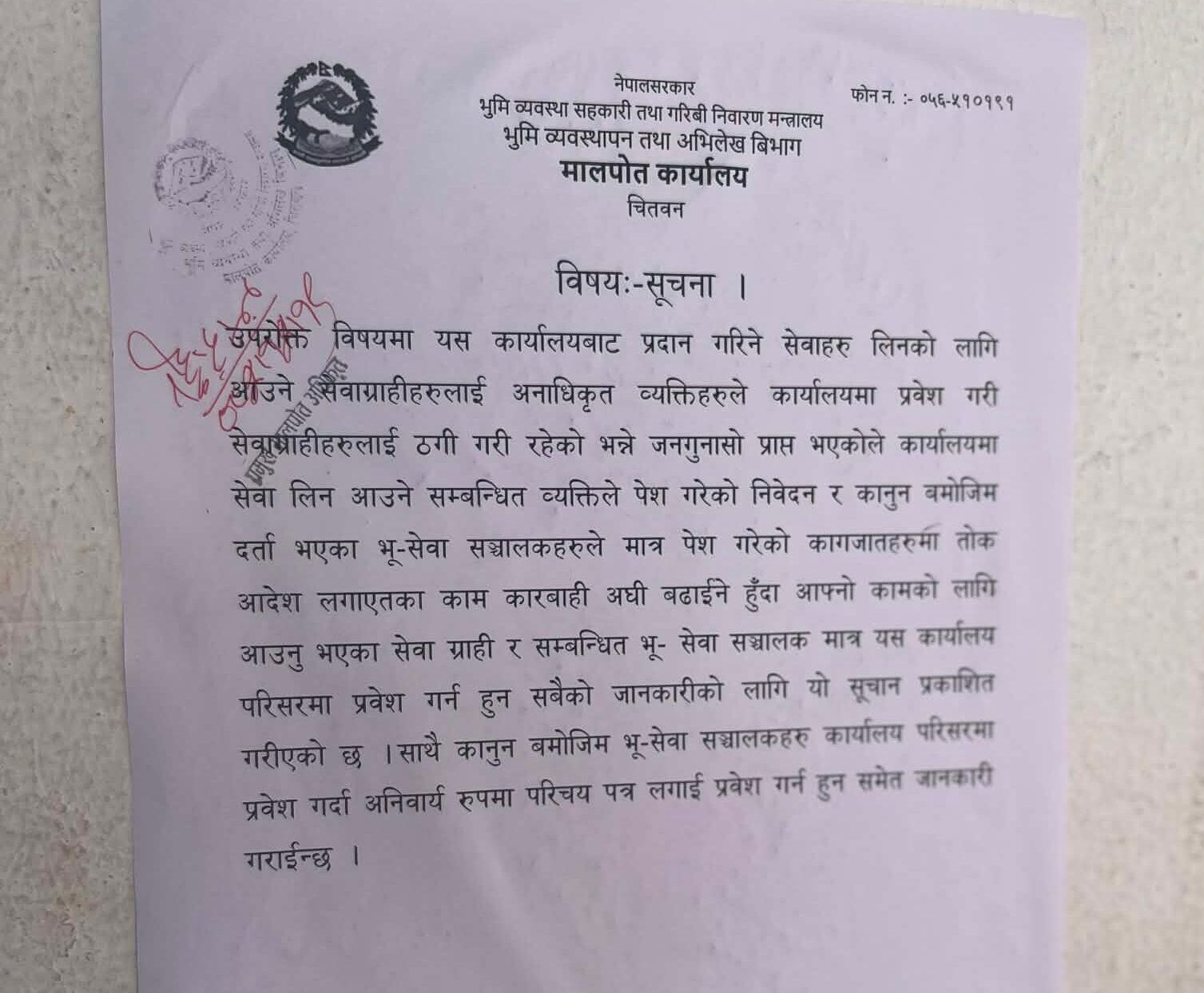मालपोत कार्यालय भरतपुरमा अनधिकृत रुपमा प्रवेश गर्ने १६ जना व्यक्तिलाई प्रहरीले गिरफ्तार गरेको छ । जिल्ला प्रहरी कार्यालय चितवनले विहीबार (आज) उनीहरूलाई गिरफ्तार गरेको हो । कार्यालयले एक सूचना जारी गर्दै अनधिकृत व्यक्तिहरूको प्रवेशमा रोक लगाएको छ । सेवाग्राहीलाई सेवा प्रदान गर्ने क्रममा केही अनधिकृत व्यक्तिहरू कार्यालयमा प्रवेश गरी सेवाग्राहीलाई झुक्याउने तथा ठगी गर्ने गरेको गुनासो आएपछि यस्तो निर्णय गरिएको हो।