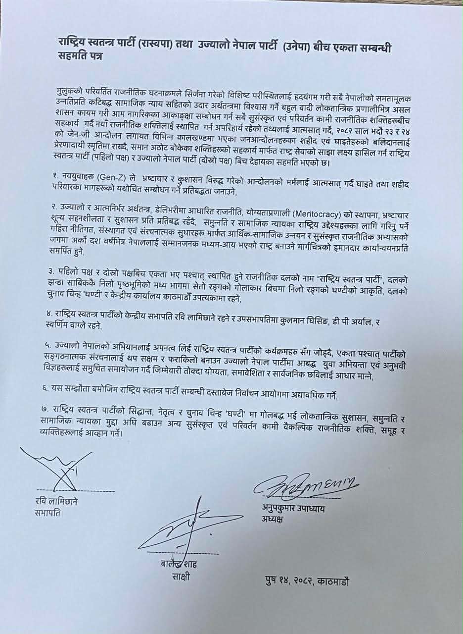 राष्ट्रिय स्वतन्त्र पार्टी (रास्वपा) तथा उज्यालो नेपाल पार्टी (उनेपा) बीच एकता सम्बन्धी सहमति यस्तो छ